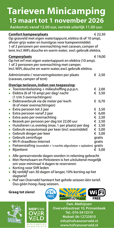Rust, ruimte en ontspanning zijn de voornaamste ingrediënten voor ‘n aangenaam verblijf op onze minicamping. Ruime kampeerplaatsen op een mooi groen terrein. Landelijk gelegen aan de rand van het kerkdorp Prinsenbeek onder de rook van Breda. Deze historische stad biedt legio uitgaansmogelijkheden. Fiets- en wandelmogelijkheden in combinatie met de moderne voorzieningen (verwarmd sanitair), GRATIS WIFI, goede ontvangst op het gehele terrein, en bij elke plaats is stroom en een watertappunt aanwezig.
